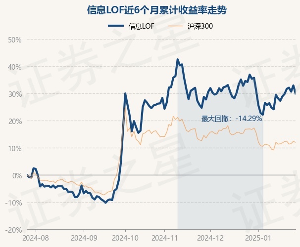 本站消息,1月27日,信息LOF最新单位净值为0.9381元,累计净值为1.9299元,较前一交易日下跌2.2%。历史数据显示该基金近1个月下跌3.96%,近3个月上涨3.52%,近6个月上涨30.04%,近1年上涨38.16%。该基金近6个月的累计收益率走势如下图: