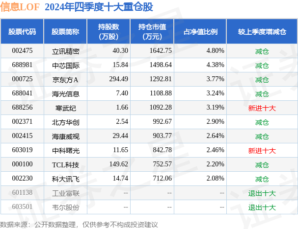 信息LOF为指数型-股票基金,根据最新一期基金季报显示,该基金资产配置:股票占净值比94.6%,无债券类资产,现金占净值比5.98%。基金十大重仓股如下: